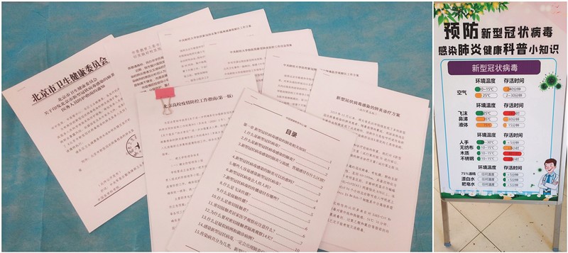 校医院第一时间起草完成了《中央财经大学校医院新冠肺炎防控工作应急预案》,明确医院内部职责分工,对假期校园内防控工作进行了细致安排:一、两校区校医院均设立预检分诊台,对每位就诊患者进行测量体温、询问有无流行病接触史,并进行严格登记,遇到发热病例及时规范转诊;二、挂号处、候诊区地面张贴“一米线”标识,保持安全距离,诊室、工作区域要求空气消毒、消毒液擦拭物体表面,防止院内交叉感染;三、设立集中医学观察中心,对提前返校师生集中统一隔离观察,并为其免费发放口罩、体温计,指导师生进行体温健康监测;四、做好学生开学返校前准备工作,并对开学后可能发生的疫情提前预判,制定应对措施;五、做好保卫处、食堂、物业人员消毒、人员防护培训,指导做好学校公共区域的消毒杀菌工作和工作人员的健康监测工作,牢牢掌握疫情防控的主动权。